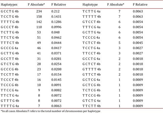 In the estimation of haplotype frequencies for the six polymorphisms studied, it was found that the most frequent was GCCTG4b (21.2%) from a total of 38 haplotypes detected in the 1,104 chromosomes analyzed (Table 5).