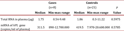 RNA extract was achieved from 100% of plasma samples. The results of the quantification of total RNA from plasma and hPL mRNA expression are described in Table 3. There were no statistically significant differences in the concentration of total RNA or mRNA expression of hPL (p= 0.5975 and 0.5785, respectively).