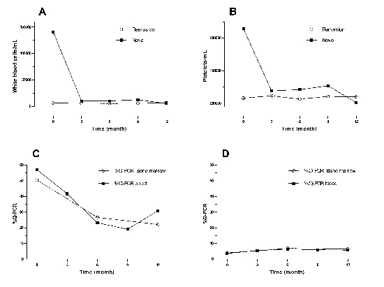 The novo group responded quickly to the imatinib with complete responses after 3 months of 79.1%, which increased to 84.2% by the end of the study. In the CCR group after 9 months, 13.6% had lost the hematologic response, although at 12 months all the patients that were evaluated remain in CHR. Figure 1 shows the evolution of the white blood cell and platelets count in the novo group.