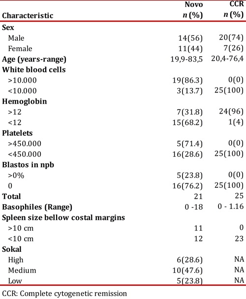Twenty-five patients were included in the de novo group and 27 in the CCR group, for a total of 52. At the end of the follow-up, 18 patients remained assessables in the de novo group and 19 in the CCR. The losses of the first group were due to three disease-related deaths, one follow-up loss, two to voluntary withdrawals from the study and one to change to another drug; in the second group, one death after an angioedema not related to the illness, three due to therapy failure, two follow-up losses and two voluntary withdrawals. The median dose of imatinib was 400 mg/day, un patient went up to 600 mg and six to 800 mg; when the study was concluded, 4 patients switched to a second generation tyrosine kinase inhibitor (3 dasatinib y 1 nilotinib). After 12 months, 50% of the patients from the de novo group had treatment failure while in the CCR group 11% relapsed. In Table 1, patient's overall characteristics are shown.