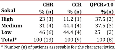 In the de novo group, 23.8% remained with low risk, 47.6% remained in medium and 28.6% in high. Table 2 shows the cytogenetic and molecular hematologic response rate according to the Sokal risk in the de novo group at 12 months.