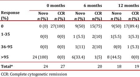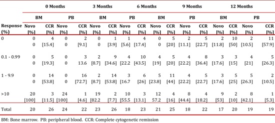 Results: The group with the novo diagnosis showed 50% of complete cytogenetic remission at 12 months while the other 50% were considered to have primary resistance. Respect the molecular analysis, 10.5% of the patients reached undetectable BCR-ABL transcripts at 12 months. In the complete cytogenetic remission group, 10.6% lost the state of complete cytogenetic remission at 12 months, 50% reached undetectable BCR-ABL transcripts but 10% showed levels higher than 10%, which in our standardization was equal to no molecular response.