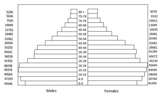 Currently, the BMA has 1,094,390 inhabitants (taken from the 2005 National Census Projections) corresponding to 53% of the total population of Santander. figure 1 shows the distribution of the BMA population by age and sex. Overall, men constitute the 48% of the population, 26% and 22% of the population is under age 15 and over age 50, respectively, and 94% of the population resides in the urban area. Furthermore, the BMA population is considered racially mixed (high genetic variability) with low socioeconomic differentiation6.