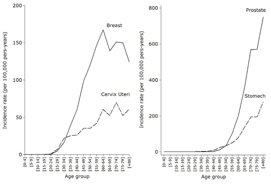 ASIR(W) for all cancers, excluding non-melanoma skin cancer, was 162.8 per 100,000 person-years in women and 177.6 per 100,000 person-years in men. In women, the types of malignant tumors with the highest incidence rates were breast (41.9 per 100,000 person-years), cervix (17.3 per 100,000 person-years), colorectal (12.2 per 100,000 person-years), stomach (10.3 per 100,000 person -year) and thyroid (9.7 per 100,000 person-years) (Table 2). In men, the highest incidence rates were reported for prostate cancer (50.5 per 100,000 person-years), stomach (22.4 per 100,000 person-years), colorectal (13.3 per 100,000 person-years), lung (11.6 per 100,000 person-years) and lymphoma (9.6 per 100,000 person-years).Crude incidence rates for the two most common cancers among women showed progressive increases with age that began around the second decade of life (figure 2), however, unlike cervical cancer, whose incidence increased steadily, breast cancer reached a peak incidence in women aged 60-64 years, showing then a downward trend. Regarding the behavior of crude incidence rates in men, although prostate cancer and stomach cancer showed sustained increases with age (figure 2), the first cases of prostate cancer were registered among individuals 40-45 years old, that is, about two decades later than in gastric cancer.