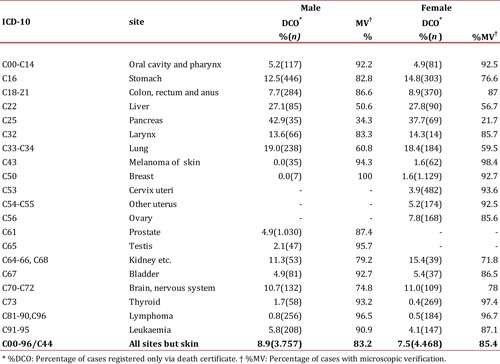 Cases obtained from hospital discharges and death certificates were ascertained following a process of diagnosis verification by reviewing clinical histories. In the absence of clinical information, a case was labeled as identified by death certificate only (DCO). Coding of cancer cases was performed by a pathologist with training in the use of the International Classification of Diseases in Oncology, Third Edition (ICD-O-3), and the rules for multiple primary tumors of the International Agency for Research on Cancer (IARC)10,11.