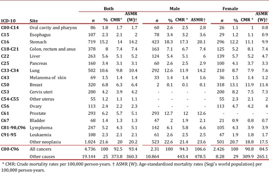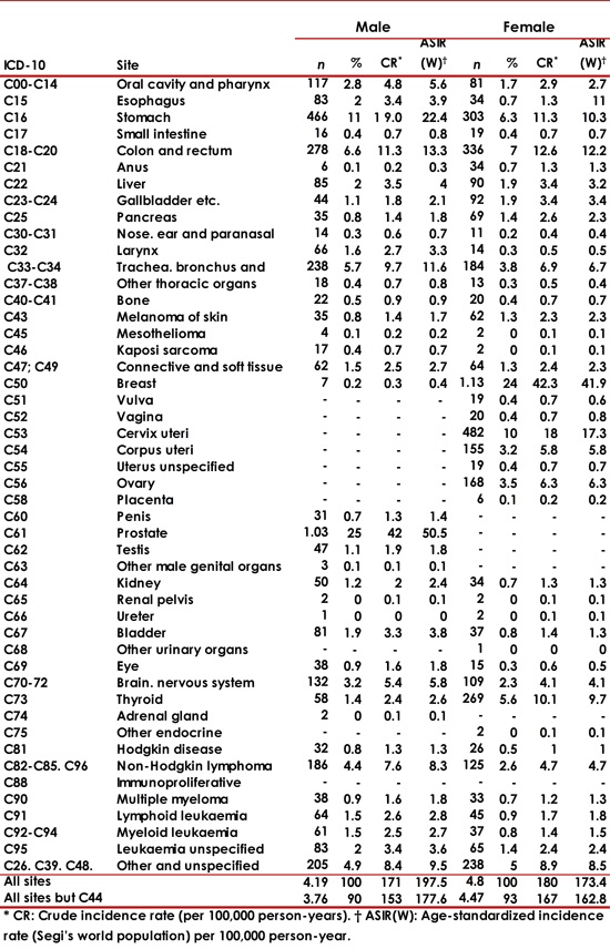 Results: We identified 8,225 new cases of cancer excluding non-melanoma skin cancer (54.3% among women). Of all cases, 6,943 (84.4%) were verified by microscopy and 669 (8.1%) were detected only by death certificate. ASIR(W) for all invasive cancers was 162.8 per 100,000 women and 177.6 per 100,000 men. Breast, cervix, colorectal, stomach and thyroid were the most common types of cancer in women. In men, the corresponding malignancies were prostate, stomach, colorectal, lung and lymphoma. ASMR(W) was 84.5 per 100,000 person-years in women and 106.2 per 100,000 person-years in men. Breast and stomach cancer ranked first as causes of death in those groups, respectively.