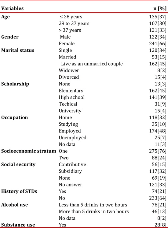 As part of the BAFI search strategy between the years 2008 and 2009; 363 adults from the socioeconomic strata 1 and 2, living currently in Popayan, were interviewed. The mean age of the participants was 33.5 ± 10.2 years. The main demographic results are shown in Table 1.