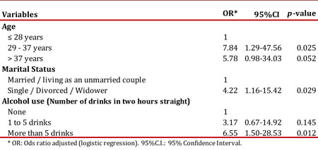 The variables reported in Table 2. were looked at in a multivariate model analysis showing a higher probability of HIV positive diagnosis in people in the 29-37 years age interval group, those not living with a stable partner, as well as in those with history of five or more drinks in less than two hours. The model obtained is shown in Table 3.