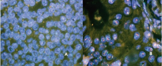 Conversely, the FISH methodology allows evaluation of the state of amplification of HER2, it has greater sensitivity and specificity, and it is based on the application of a DNA probe that hybridizes with HER2, as evidenced by a fluorescent signal. Since all cells contain the genes for HER2, and chromosome 17, it is possible to carry out a simultaneous evaluation process for the quality of nucleic acid preservation (internal tissue control). In cases where there is an amplification of the oncogene, an increase in the number of signals corresponding to HER2 is identified and an increase in relation to the signals of the gene and the centromeric signals of cromosome 1714(Fig. 2). This methodology requires a fluorescence microscope and additional equipment which makes it more expensive and therefore restricted to specialized laboratories.