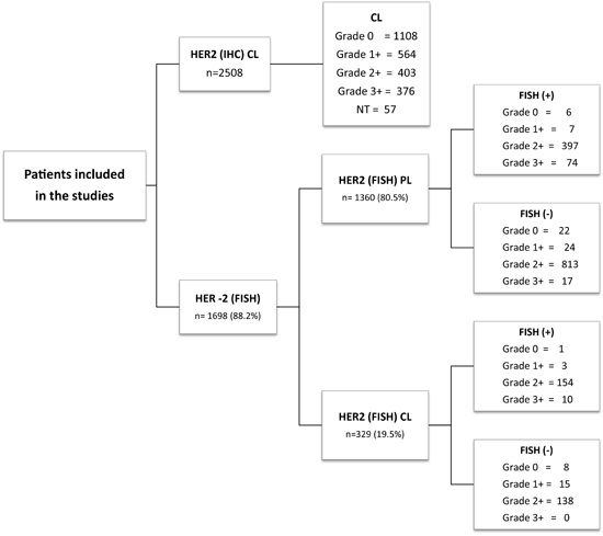Distribution of cases in the study is shown in Figure 3. All samples were reviewed by two pathologists to confirm the diagnosis of invasive BC. The vast majority of cases referred by the PL correspond to samples in which the result of IHC was ambiguous (2+) and were sent to the CL for the confirmatory FISH study. For studies conducted at the CL, 4µm sections obtained from the paraffin blocks were mounted on electrically charged plates and analyzed by IHC using the Herceptest methodology (Dako K5204) following the manufacturer's instructions. The interpretation of the results was performed following the guidelines recommended by ASCO/CAP11,12.