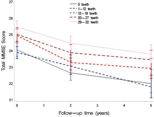 Table 4 shows the adjusted mixed models predicting total MMSE scores over the five-year follow-up as a function of number of teeth and other characteristics. In Model 1 there was an overall drop of 0.48 points (SE ± 0.02, p <0.0001) for total MMSE scores each year. Also, those with fewer teeth (0-12) compared to participants with more teeth (13-32), had significantly lower total MMSE mean scores (estimate= -0.56, SE ± 0.16, p <0.001). In Model 2, the results remained significant (estimate= -0.36, SE ± 0.13, p <0.01). For the longitudinal results, those with fewer teeth (0-12) compared to participants with more teeth (13-32), had a greater decline in total MMSE scores through five years of follow-up. There was a drop of 0.13 fewer points each year (SE ± 0.05, p <0.01) in Model 3, and 0.12 fewer points each year in Model 4 (SE ± 0.05, p <0.01).
