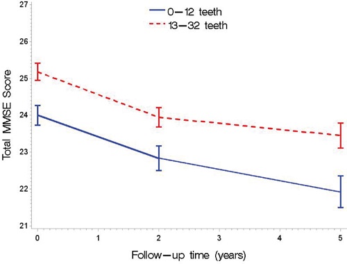 Figures 1 and 2 present unadjusted means in total MMSE scores (with 95% confidence intervals) by categories of number of teeth (five categories and dichotomized, respectively) as measured at baseline and at two and five years follow-up. Participants with fewer teeth tended to have significantly lower scores of MMSE (vertical lines) compared to those with more teeth at baseline and at follow-up. This association was stronger when the number of teeth was dichotomized (according to the non-overlapping confidence intervals). On the other hand, the slopes of decline (oblique lines) were deeper for participants with fewer teeth when compared to participants with more teeth, especially when the number of teeth was dichotomized (for 0-12 teeth its estimate is -0.16 SE± 0.05; the reference is 13-32 teeth; p= 0.0009). Therefore, we chose to dichotomize the variable for the number of teeth in the multivariate analyses.
