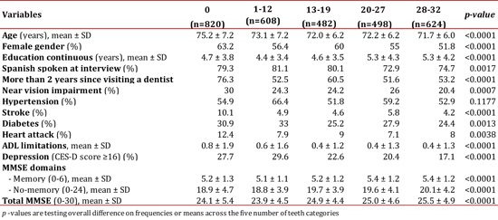 For further analyses, we dichotomized the number of teeth (0-12 vs. 13-32) because there was no statistically significant difference on MMSE scores at follow-up between group 1 (edentulous or 0 teeth) and group 2 (1-12 teeth). However, the other groups (3= 13-19 teeth; 4= 20-27 teeth; and 5= 28-32 teeth) had statistically significant lower MMSE scores when compared to groups 1 and 2 (p <0.05).