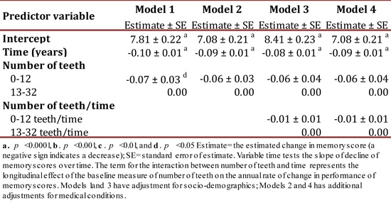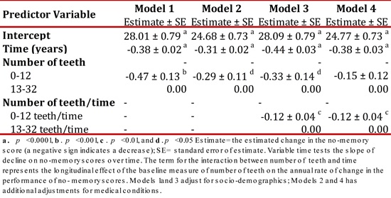 Estimate= the estimated change in memory score (a negative sign indicates a decrease); SE= standard error of estimate. Variable time tests the slope of decline of memory scores over time. The term for the interaction between number of teeth and time represents the longitudinal effect of the baseline measure of number of teeth on the annual rate of change in performance of memory scores. Models 1and 3 have adjustment for socio-demographics; Models 2 and 4 has additional adjustments for medical conditions.