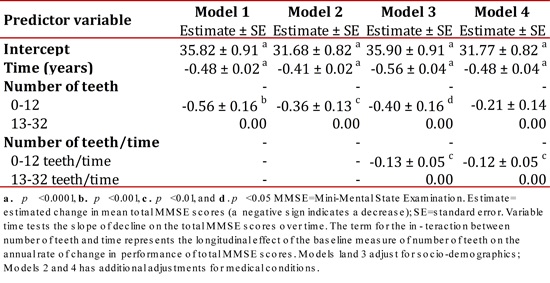 MMSE=Mini-Mental State Examination. Estimate= estimated change in mean total MMSE scores (a negative sign indicates a decrease); SE=standard error. Variable time tests the slope of decline on the total MMSE scores over time. The term for the interaction between number of teeth and time represents the longitudinal effect of the baseline measure of number of teeth on the annual rate of change in performance of total MMSE scores. Models 1and 3 adjust for socio-demographics; Models 2 and 4 has additional adjustments for medical conditions.