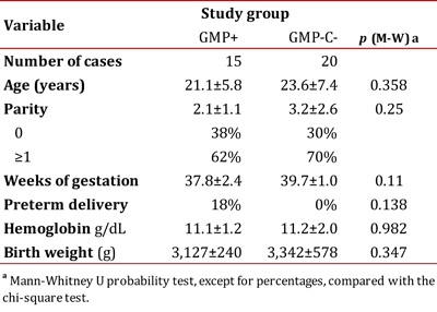 A total 35 pregnant women were included in the study, 15 were allocated to the GM+ group and 20 to the GM-. . No significant differences were observed in the clinical and epidemiological variables between the two groups (Table 1). In both groups, there was a significant linear correlation between age and parity (rho = 0.868, p = 0.000) and parity and birth weight (rho = 0.628, p = 0.000). Pre-term delivery was observed in the GM+ group and absent in the GM- group.