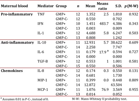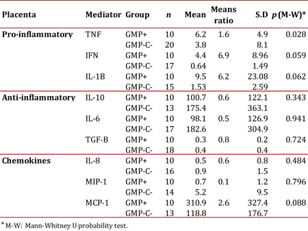 Results: The clinical and epidemiological variables explored were similar in both groups, with the exception of gestational age. When comparing the GM+ group with the GM- group, it is clear that although the differences generally are not significant, pro- inflammatory cytokines are elevated in both maternal blood and placental; anti-inflammatory ones are elevated in the mother and reduced in the placenta, and the chemokines are reduced in both compartments, except for MCP-1 which is elevated in all.