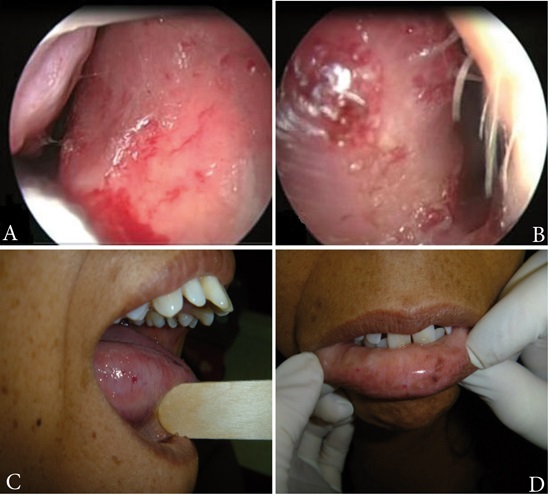 Patient, 38 years of age, in consultation due to a condition of recurring epistaxis since eight years of age, which appeared with a frequency of two to three episodes per day, in light to moderate amount. On multiple occasions, the patient had required nasal packing and cauterizations. Secondary to the epistaxis, the patient presented iron-deficiency anemia, for which the patient received several blood transfusions. The patient's family group included the patient's mother and a son, both presenting a similar clinical condition. Physical exam evidenced telangiectasias in lower turbinates and bilateral nasal septum, as well as on the oral mucosa and tongue (Figure 1). No cutaneous lesions were found. Upper GI endoscopy was performed, showing a 3-mm ruby-colored flat lesion on the lesser curvature of the stomach (gastric angiodysplasia). Through pulmonary arteriography right pulmonary arteriovenous malformation was detected.