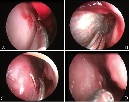 To control epistaxis episodes, the patient was taken to surgery and a modified septal dermoplasty technique was performed, consisting of a hemitransfixion incision on the caudal septal with No. 15 scalpel blade, followed by a septal dissection at supra-perichondric level with the Cottle dissector, creating an upper and lower ipsilateral tunnel. Then, the septal mucosa was resected leaving a small upper and lower mucosa flap. Synthetic dural graft (Surgisis( BiodesignTM -Dural Graft, REF G31092, made in the United States) was placed on the perichondrium, leaving it covered by the upper and lower mucosa flaps. Thereafter, an absorbable suture stitch was placed transfixing on the anterior and posterior septum; this was then covered with Surgicel(. This procedure was carried out unilaterally. During subsequent controls, adequate epithelization of the graft was noted along with decreased episodes of bleeding. After three months, the patient was again taken to surgery to perform this same procedure on the contralateral nostril (Figure 2). After surgery, there was no evidence of septal perforation, infection, telangiectasias on borders, loss of smell, or any other complication, completing one year of postoperative follow up.