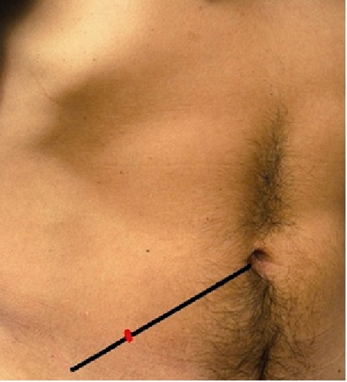 The "umbilical spinous line" is an imaginary line traveling from the umbilicus to the right anterior superior iliac spine and concerning it is included the traditional term, "McBurney point", which corresponds to the point that defines the lateral and middle third of that line. At that point and depth, it lies at the base of the vermiform appendix2 (see Fig.1).
