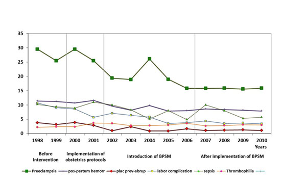 The reduction of complications of labor was of 34.4% (median: 8.6 x 105 versus 6.4 x 105 live newborns), by hemorrhage (postpartum, placenta preview and abruption of placenta) of 25% (median:11.3 x 105 to 8.5 x 105 live newborns), by embolism of 3.7% (median 2.8x 105 versus 2.7x 105 live newborns), by sepsis of 2.0% (median 10.2x 105 versus 10.0x 105 live newborns), and by thrombophilia of 1.7% (median 2.87x 105 versus 2.82x 105 live newborns).