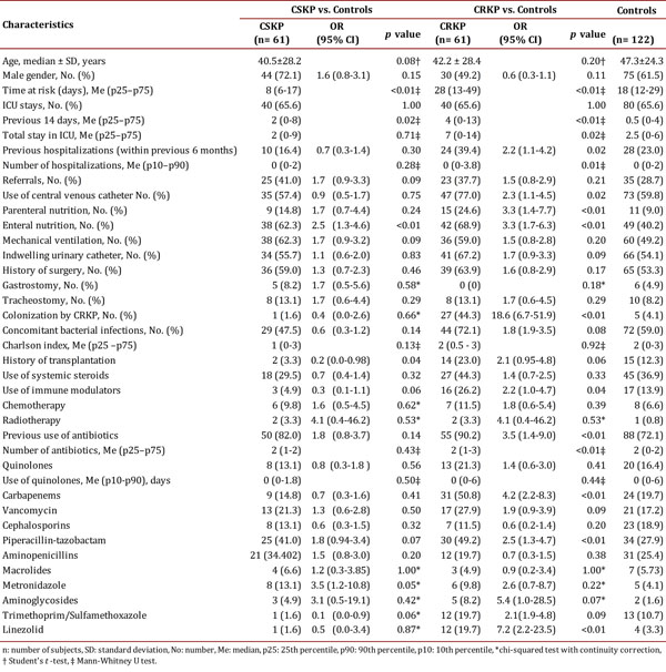 Analysis of the CRKP-infected patients vs. controls