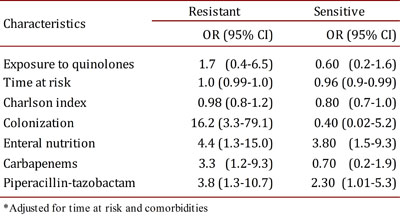 Table 3 shows the results adjusted for the selected variables. Use of piperacillin-tazobactam and enteral nutrition was associated with infection in the two models, whereas use of carbapenems and colonization by CRKP was associated with infection in the model that compared CRKP with the controls. Quinolone exposure was not found to be associated with infection in the two models.