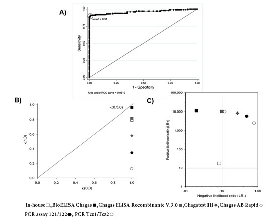 For all commercial kits, each value of sensitivity, specificity, positive predictive value (PPV), negative predictive value (NPV), and ROC, as well as its own confidence intervals were estimated by using cut-off values recommended by manufacturers. Similarly, LR+ and LR- were estimated, as well as quality of sensitivity (κ (1,0)), specificity (κ (0,0)), and efficiency (κ (0.5,0)) 14,15. Statistical analyses were performed using the software STATA version 10 (STATA Corp., College Station, Texas; USA).