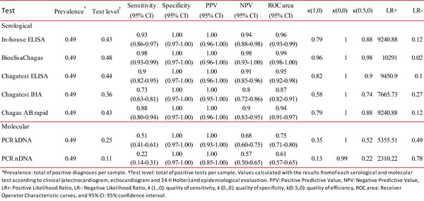 Methods: Analytical study, using the case-control design, which included 205 people (patients with Chagasic cardiomyopathy, n= 100; control group, n= 105). Three enzyme linked immunosorbent assays, one indirect hemagglutination assay and one immunochromatographic test were assessed. Additionally, DNA amplification was performed via the PCR method using kinetoplast and nuclear DNA as target sequences. For the comparative analysis of diagnostic tests, the parameters used were sensitivity, specificity, positive and negative predictive values, Receiver Operator Characteristic (ROC), positive and negative likelihood ratio, as well as κ quality analysis.
