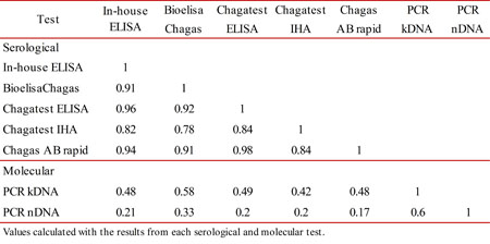 Conditional and unconditional probabilities for each serological and molecular test, as well as their analysis of quality are listed in Table 1. Among all the tests performed in this study, Bioelisa Chagas showed the highest values of sensitivity, specificity, PPV, NPV, and discriminatory ability (Table 1 and Fig. 1B). Otherwise, the PCR assays used to detection T. cruzi DNA in blood samples showed low sensitivity values, but high specificity values; however, they showed moderate to low discriminatory ability (Table 1 and Fig. 1B). In addition, correlation analysis of serological methods was higher than molecular methods, which were moderate to low (Table 2).