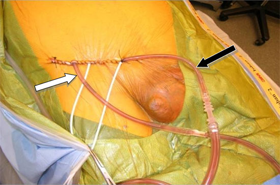 Upon completion of CRS, two catheters (an inflow and outflow) were inserted into the groin. These catheters were secured temporarily with sutures (Fig. 1). While the inflow catheter extends into the scrotum, the outflow catheter remained proximal in the groin. Hyperthermic chemoperfusion of the scrotum was carried out by using 20 mg of Mitomycin-C for 60 min with an inflow temperature maintained at 43° C and an outflow temperature of 41-42° C.