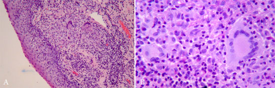 Patient male age 7 years old, from Riosucio (Caldas, Colombia), who consults with clinical picture of three weeks duration of diarrhea, odynophagia, hiporexia, headache, occasional fever, stridor during sleep, osteomialgias and decay. Presents a history of renal transplant three years ago, bilateral congenital oligomeganefronia with secondary chronic renal failure. Receiving medications such as Tacrolimus, Mycophenolate and Diltiazem. Physical examination shown erythematous tonsils with mild hypertrophy, stridor and cervical lymphadenopathy. Paraclinical reported a blood count and neutrophil leukocytes, C-Reactive Protein: 1.6, coprological techniques: normal, negative urine culture, negative PPD test, tests for Epstein Bar virus, cytomegalovirus, Aspergillus galactomannan and BK polyomavirus negative. The chest radiograph was found parahiliar congestion without bindings and abdominal ultrasonography showed chronic graft nephropathy with normal characteristics, without further alteration. Fiber Optic Laryngoscope is performed and is found edema of granulomatous aspect of supraglottic mucosa which deforms the epiglottis and partially obstructs the airway (Fig. 1). A tracheostomy tube and subsequently mass biopsy was performed without being found necrosis chronic granulomatous inflammation (Fig. 2). Immunohistochemical study discarded lymphoepithelial lesion. In addition colorations were performed for fungi and mycobacteria were negative (BK, PAS, Gomori). Suspecting fungal infection is requested titles for coccidioidomycosis and immunodiffusion for Histoplasma, the latter resulting positive. Primary diagnosis of laryngeal histoplasmosis is made (discarding pulmonary focus). The culture Urine and blood cultures for bacteria and fungi were negative at 42 days of incubation. Amphotericin B is initiated at 0.8 mg/ kg/day, and 10 days is changed to Itraconazole 6 mg/kg orally every 12 h for signs of nephrotoxicity, to continue for 12 months on an outpatient basis.