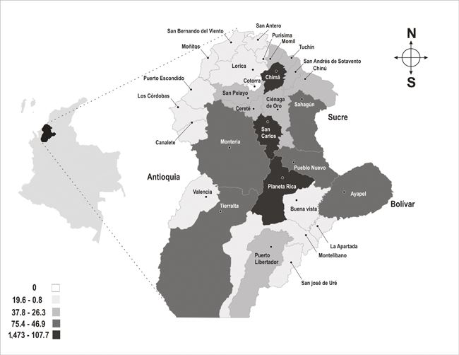 The municipalities in the department of Córdoba with the highest incidence of cases of dengue between 2003 and 2010 were: San Carlos, Chima, and Planeta Rica with a mean incidence of 147.3, 146.7, and 107.7 cases/105 inhabitants, respectively (Fig. 2).