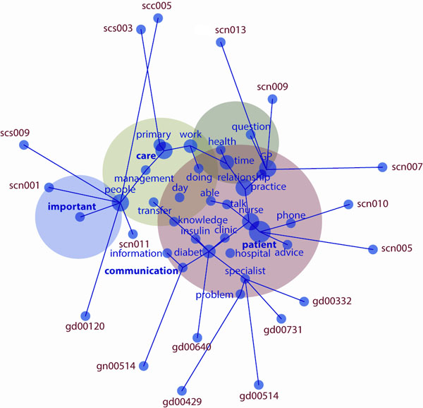 This map shows four key themes (conceptual groups semantically related) ranked according to the relevance or connectivity: "patient" had 100% of connectivity within other semantic groups, "care" (49%), "communication" (18%) and "important" (3%). Additionally, it was identified how each respondent was closely related with each semantic group. The "gd" codes represent each general practitioner, "gn" practices nurses, "scn" diabetes nurse specialist and "scc" endocrinologists.