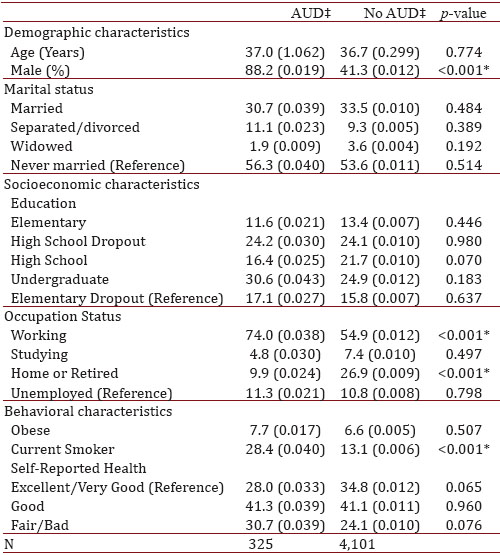 Table 1 shows socio-demographic and behavioral characteristics on both populations of interest. In particular, people with AUD comprised 9% of the population, of which 88% were males and on the average 37 years old. The predominant marital status was never married (56%) followed by married (31%). Over 30% of these had high levels of education (undergraduate), and 74% reported their occupational status as working. Obesity was a characteristic for almost 8% of this population, and 28% were smokers at the time of interview. Lastly, 41% of people with AUD self-reported their health status as good.