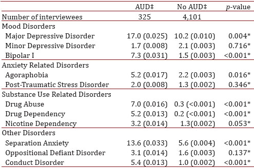 Resultados: las personas con AUD fueron el 9% de la población, de los cuales 88% eran varones y en promedio tenían 37 años. Estas personas tenían trabajo y eran fumadores activos; y tenían menos probabilidad de estar en casa o ser jubilados. La población con AUD tenía mayores posibilidades de cumplir con los criterios de todos los trastornos, excepto el trastorno depresivo menor, el trastorno de estrés post-traumático, la dependencia a la nicotina, y el trastorno oposicional desafiante.