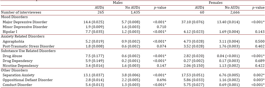 Table 2 shows prevalence estimates of mental disorders for the total population; Table 3 for males and females, and present statistical tests on differences in prevalence by whether individuals have alcohol abuse/dependency problems. For all individuals and for males, all mental disorders studied were more prevalent for people with AUD with the exception of minor depressive disorders, PTSD, nicotine dependency, and oppositional defiant disorder. For females, five mental disorders were more prevalent among persons with AUD: major depressive disorder, drug abuse, separation anxiety, oppositional defiant disorder, and conduct disorder.