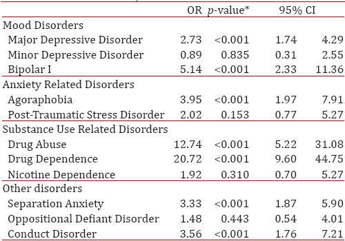 Regression analyses are reported in Table 4. The table only reports the OR for the AUD population; nonetheless the regression analyses included all variables described in Table 1 as regressors. In that sense the results reported are ORs after accounting for differences in demographic, socio-economic, behavioral and self-reported health status variables. As shown in Table 4 the population with alcohol AUD were more likely to be diagnosed with all disorders but minor depressive disorder, PTSD, nicotine dependence, and ODD.