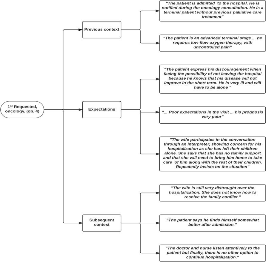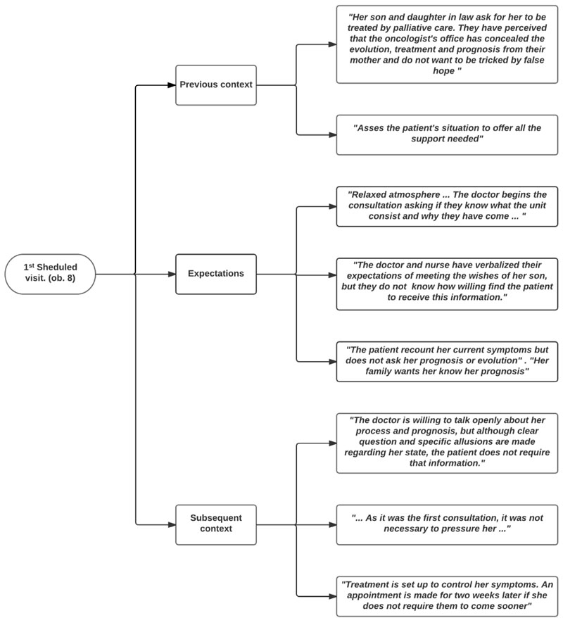 Given the possible context and conditions for the observations of selected cases, the following criteria were considered: a) the environment of the end-of-life visit-hospital, home or consultation room, and b) the reason for the visit-first visit or follow-up, requested or scheduled. All of the patients had advanced terminal cancer.