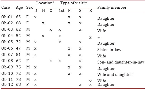 Observations took place in all of the predicted scenarios (home, hospital room and consultation room) and for all reasons for consultation (first visit, follow-up, scheduled and requested). A total of 12 observations were made. Of the patients treated, 7 were men and 5 were women, and all were aged between 47 and 81 years. In all cases, one or more family members accompanied the patient. The cases are described in Table 1.