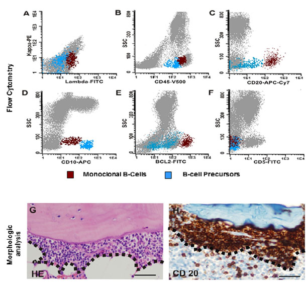 Immunophenotypic studies of BM cells, using 8-color flow cytometry approach (FACSCanto ll flow cytometer (BDB), and Infinicyt software program (Cytognos, V1.4)) detected 1% of Lambda-restricted B-cells CD45+, CD20+, CD10+, BCL2++ (Fig. 1A-F), FMC7+, CD38dim, CD200- and CD5- (Fig. 1F). BM biopsy revealed a 1% paratrabecular small cleaved lymphocyte infiltrate. Immunohistochemical staining demonstrated CD20 (Fig. 1G-H), BCL2 and CD10 expression in tumor cells.