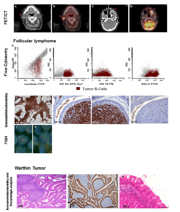 Hallazgos clínicos: Una pequeña población de células B monoclonales también conocida como linfocitosis monoclonal de células B fue encontrado dentro del estudio de una trombocitopenia idiopática que conllevó al diagnóstico de un linfoma folicular primario de parótida coexistiendo con un tumor de Warthin y un papiloma oncocítico localizado en el seno maxilar.