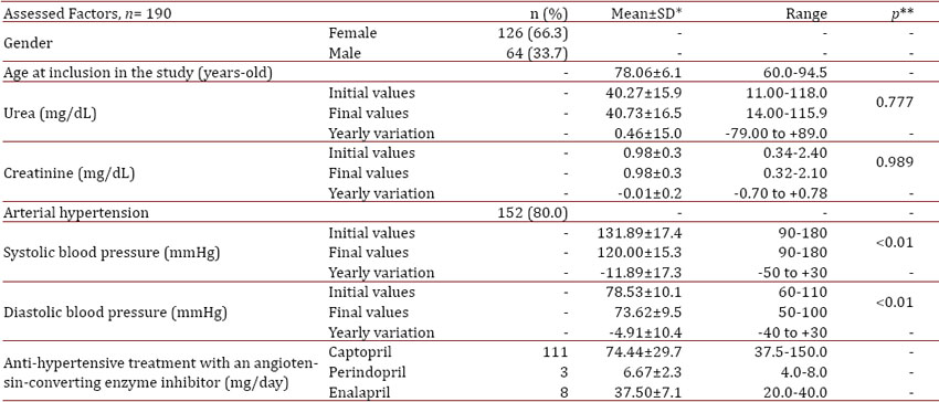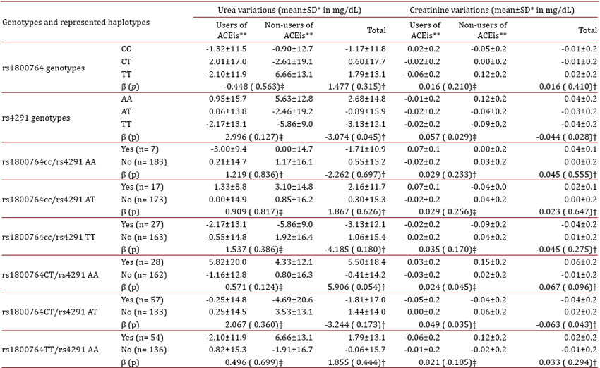 Results: For 190 patients, 152 had arterial hypertension, and 122 used ACEis. Minor allele frequencies were 0.492 for rs1800764-C and 0.337 for rs4291-T, both in Hardy-Weinberg equilibrium. There were no overall significant yearly variations in levels of urea and creatinine, but their concurrent variations were positively correlated (ρ <0.0001). Each A allele of rs4291 led to an yearly urea increase of 3,074 mg/dL, and an yearly creatinine increase of 0.044 mg/dL, while the use of ACEis was protective regarding creatinine variations. The use of ACEis was also protective for carriers of rs1800764-CT/rs4291-AA, while carriers of rs1800764-CT/rs4291-AT had steeper reductions in creatinine levels, particularly when they were treated with ACEis.