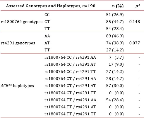 Table 2 shows genotyping results for all patients. Minor allele frequencies were 0.492 for rs1800764 (C) and 0.337 for rs4291 (T), with both variants in Hardy-Weinberg equilibrium. Of nine possible ACE haplotypes, six were represented in the sample.