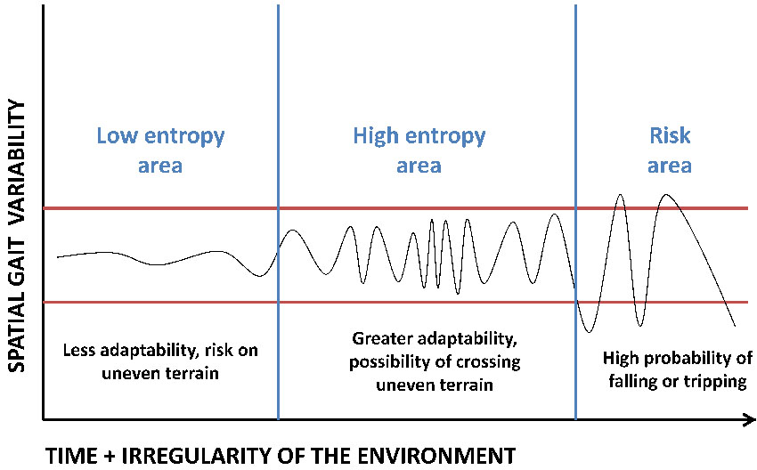 It is known that socioeconomic factors influence morbidity and population functionality34-36, data that give support to the hypothesis of this research. However, human gait is complex and of non-linear character, since it is a process of multi-systemic physiological signals with irregular fluctuations 27. Thus, a high variability within normal limits represent a greater adaptive capacity; this situation is displayed in the present study, given the behavior of the SL (Table 2). It is interesting to recapitulate the entropy concept 37, which comes from thermodynamics, and that applies to the gait for quantify the regularity of a closed system, in this case within the boundaries of normality or reference 27,28 validated for a specific population. In this scenario and considering functionality as an indicator of the interaction between motor ability of living beings and the ecological environment 38, the aging process reduces the entropy within this system, triggering a movement that is less adaptable to environmental irregularities. Therefore, variability of gait within certain limits would be a signal of adaptability to movement, and also functional reserve for motor learning (Fig. 1). Thus, the allostatic mechanisms of biological systems guarantee to make changes within certain stability, unleashing with this physiological homeostasis, and in the case of gait, the acquisition of adaptability to contingencies of environmental and related requirements to the aging process.