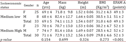Conclusions: The intra-group linear variability is consistently higher and within reference parameters for stride length during comfortable gait for elderly belonging to medium-low socioeconomic status. This might be indicative of greater complexity and consequent motor adaptability.