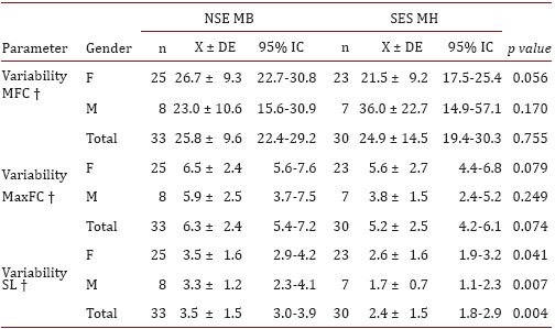 The stride length variability behavior reports statistically significant results by SES in both genders (Table 2). Moreover, it is observed that most of the data are under 6% for SES ML, and 3.5% for SES MH. In 1984, Gabell & Nayak analyzed the SL intra-group variability in healthy EP, reporting variation coefficient values that were less than 6% 31. Meanwhile, Beauchet et al. 2005, assessed in young subjects the behavior of stride variability in different spatiotemporal parameters, with and without the implementation of additional tasks (dual), reporting values close to 4% in both experimental situations 32; the interesting thing is that the most affected expression would be the SL, which is less than 1,400 mm, being less than that reported in the literature 7. In this scenario, the analysis of intra-subject variability of spatial gait parameters has clinical relevance for the specific and early diagnosis of gait's function and dysfunction in EP.