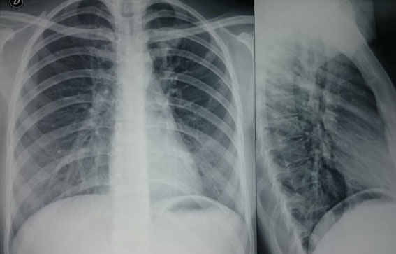 The arterial gases, serum electrolytes, gel electrophoresis of proteins, coagulation tests, quantification of serum immunoglobulins, renal (partial urine and urinary sediment, creatinine, and ureic nitrogen) and hepatic assessment studies (bilirubins, alanine transaminase, aspartate transaminase, alkaline phosphatase, serum albumin, prothrombin time) went normal. The ELISA test for HIV went negative. The Anti-nuclear antibodies and bacterial Anti-DNA resulted negative. The purified protein derivative (PPD) was 7 mm after 72 h of the test. The imaging studies informed in the chest radiograph an area of increase in density of the interstitial left apical location with interstitial left apical in relation to the regarding consolidative process (Fig. 1).