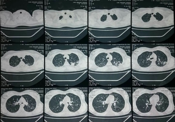 Hallazgos clínicos y métodos diagnósticos: Al examen respiratorio se halló disminución del murmullo vesicular en la región apical y estertores crepitantes basales en el pulmón izquierdo. Se realizó estudios microbiológicos de muestras tomadas por expectoración y por fibrobroncoscopia en el que se incluyó la tinción de Ziehl-Neelsen, cultivo para micobacteria y hongos en medio Agar Dextrosa Sabouraud y filamentización en suero obteniéndose positividad para Mycobacterium tuberculosis y Candida albicans.