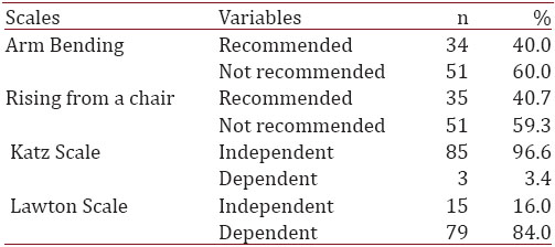 More than half of respondents did not reach the recommended scores of muscle strength of upper and lower limbs (60.0% and 59.3%, respectively). The evaluation of BADL's showed that 96.6% of the elderly can perform their tasks independently, however, to perform IADL's only 16.0% are independent (Table 1).